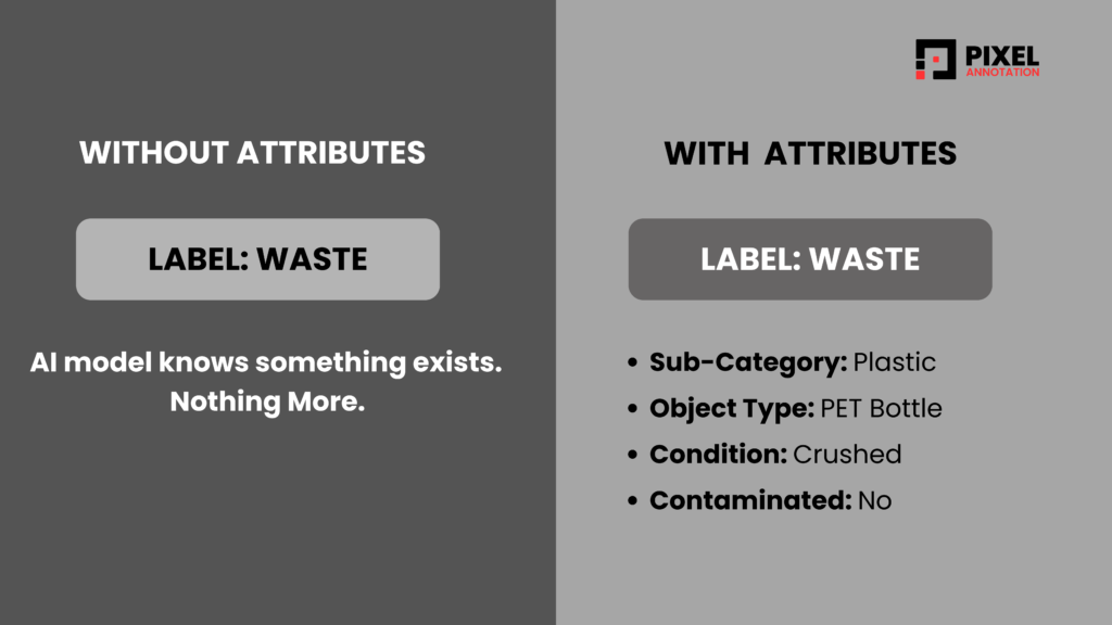 Every image annotation project begins the same way: someone draws a bounding box and assigns a label. “Car.” “Phone.” “Trash bin.” That label is the foundation — but in isolation, it is rarely enough to power a production AI model. The label tells the model what it is looking at. Attributes tell it what that thing actually means in context.