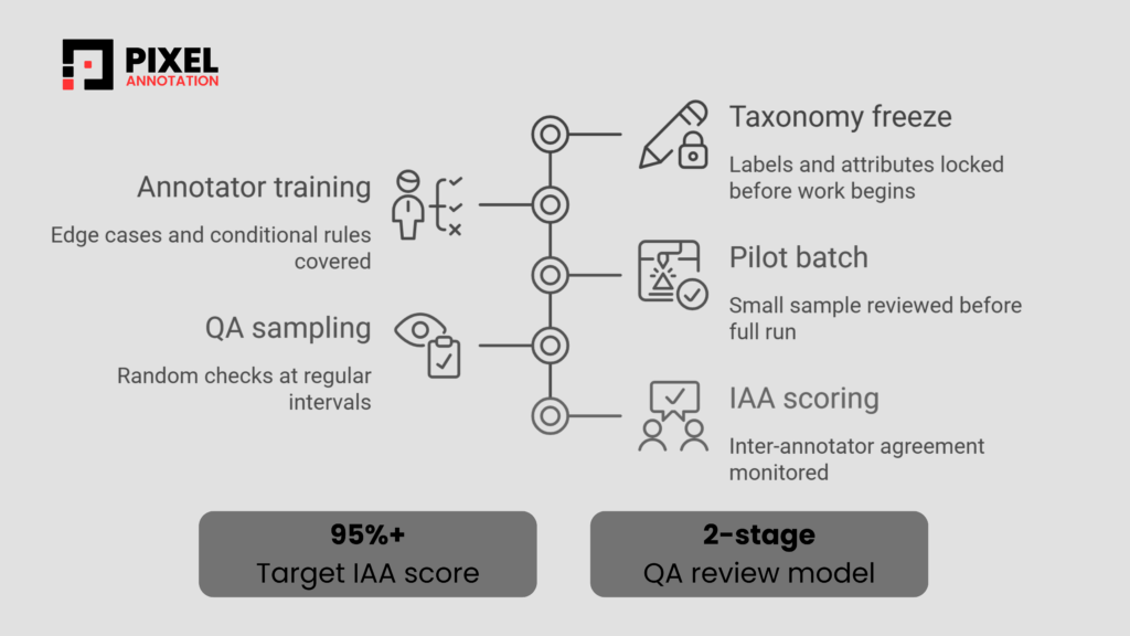 Building a rich attribute system is only half the challenge. The other half is ensuring every annotator applies it consistently, across thousands of images, over extended project timelines. Here is how a rigorous annotation workflow maintains precision at scale.